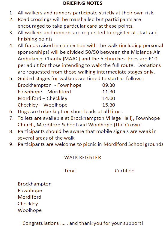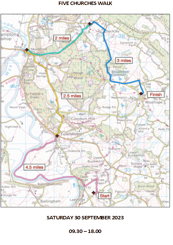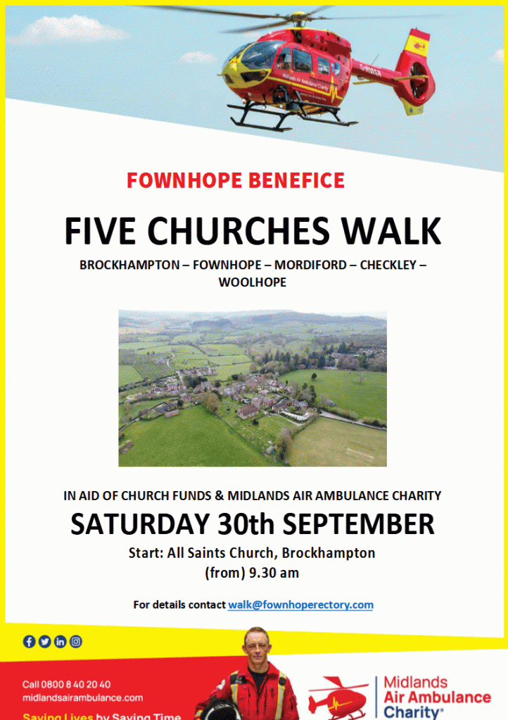 A sponsored walk linking the five churches within Fownhope Benefice is scheduled for Saturday 30th September, starting from Brockhampton at 9.30 am and finishing at Woolhope at around 5 pm: these timings are for the guided option. Walkers and runners can choose to do the whole route (approximately 12 miles) or only part of the route, in groups with leaders or independently. Tickets are £10 per adult, the proceeds to be shared between the Midlands Air Ambulance and the participating churches. Further details can be obtained via walk@fownhoperectory.com