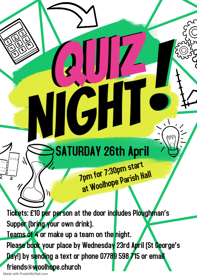 Join us for a quiz night at Woolhope Parish Hall on Wednesday, 26th April. Doors open at 7:00pm for a 7:30pm prompt start. Enter your own team of 4 people, or make up a team on the night.