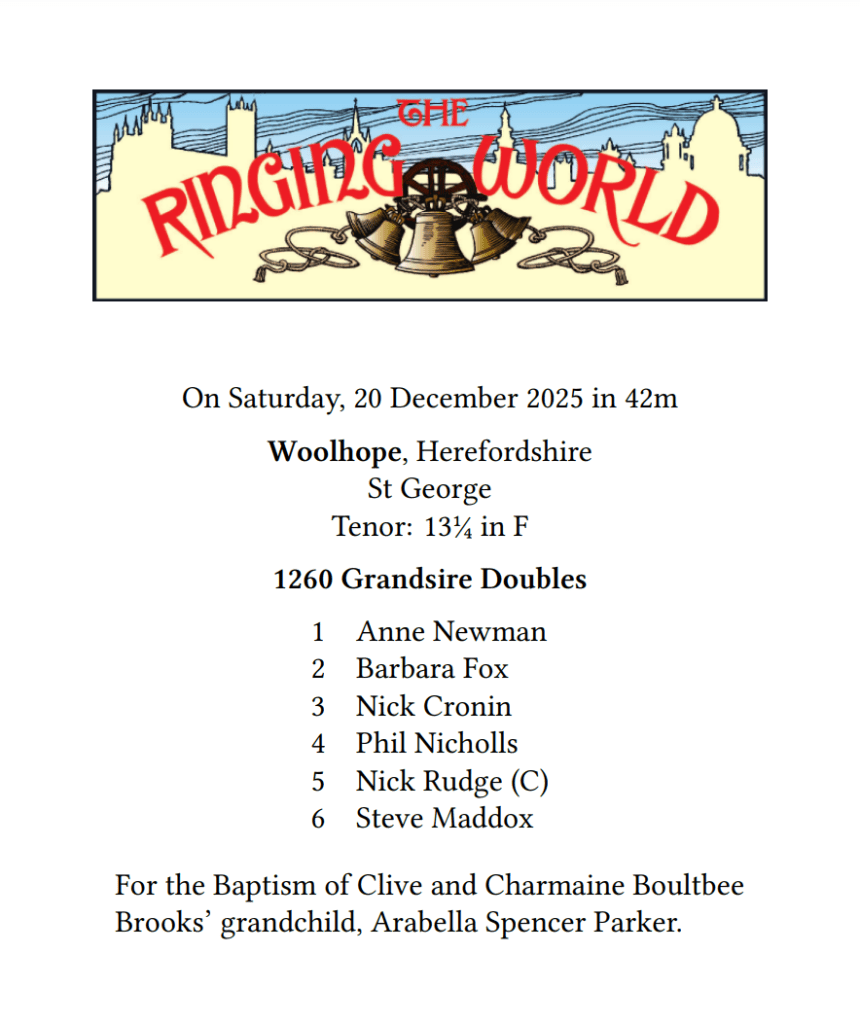 Woolhope Bell Ringers successfully completed a quarter peal at St George’s Church on Saturday 20th December 2025. This was to celebrate the baptism of Arabella Spencer Parker, granddaughter of Clive and Charmaine Boultbee Brooks, and took place before the service attended by family and friends.